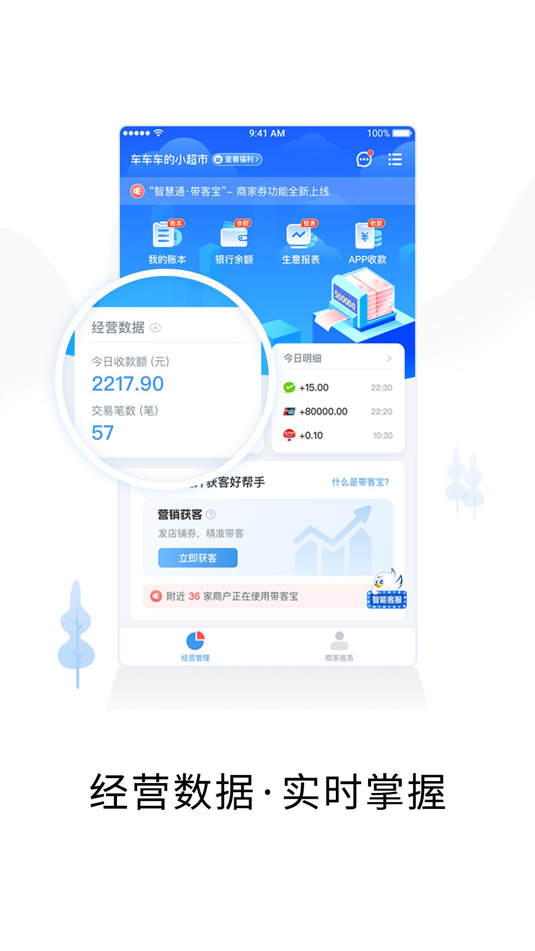 智慧商户通致力于为商户提供更安全、便捷、划算和简单的收款服务。其功能特点包括快速收款、实时到账通知、清晰的账本管理和助力经营的优惠营销,全方位满足商户的经营需求。让商户在无后顾之忧的环境下,高效便捷地处理日常交易。
