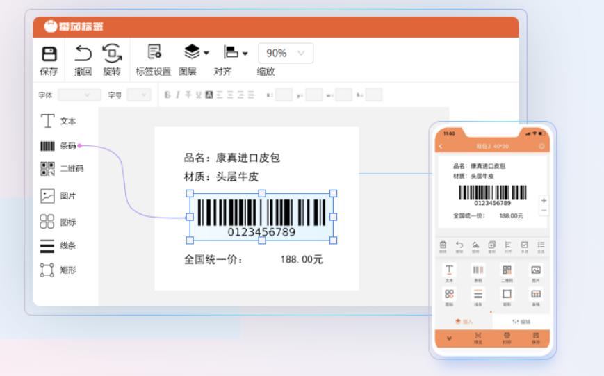 支持文字、条码/二维码、图片 / 图形、线条 / 矩形、免费表格编辑功能;可设置多字体、字号等,轻松设计任何形式的条码。