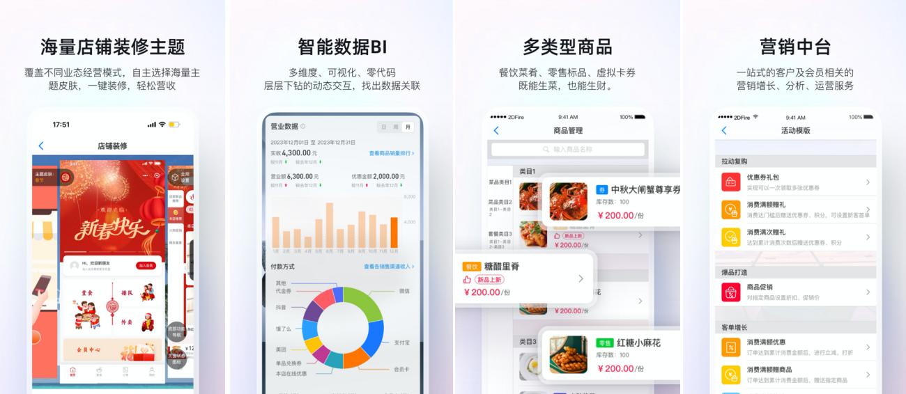 - 强大会员营销体系提供优惠券、促销活动、电子会员卡等营销工具,可帮助店铺聚集更多的会员。