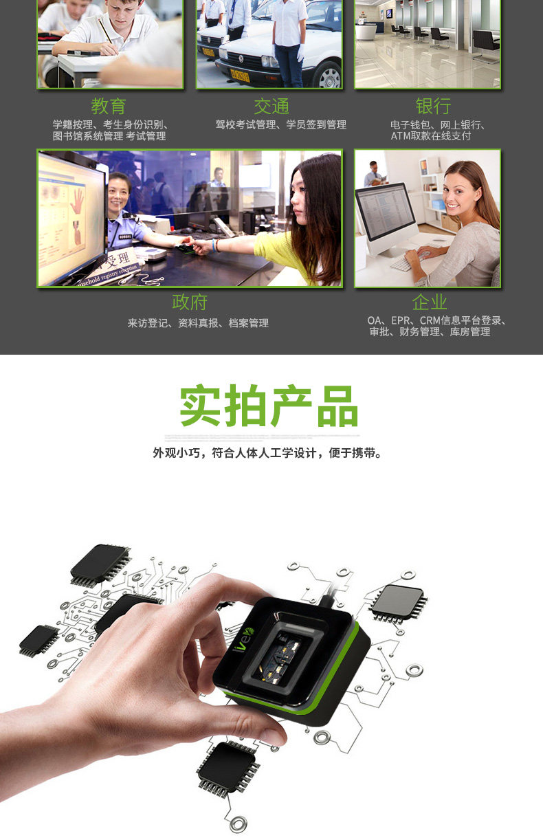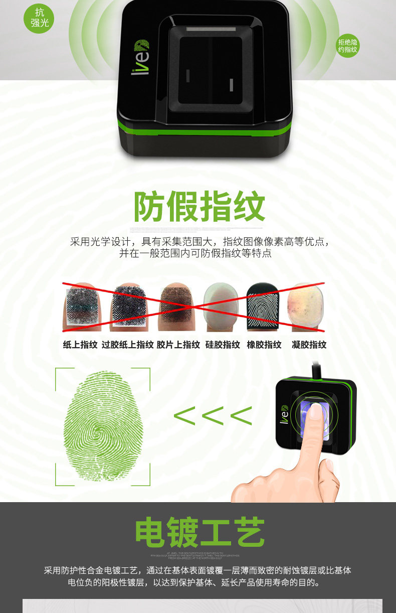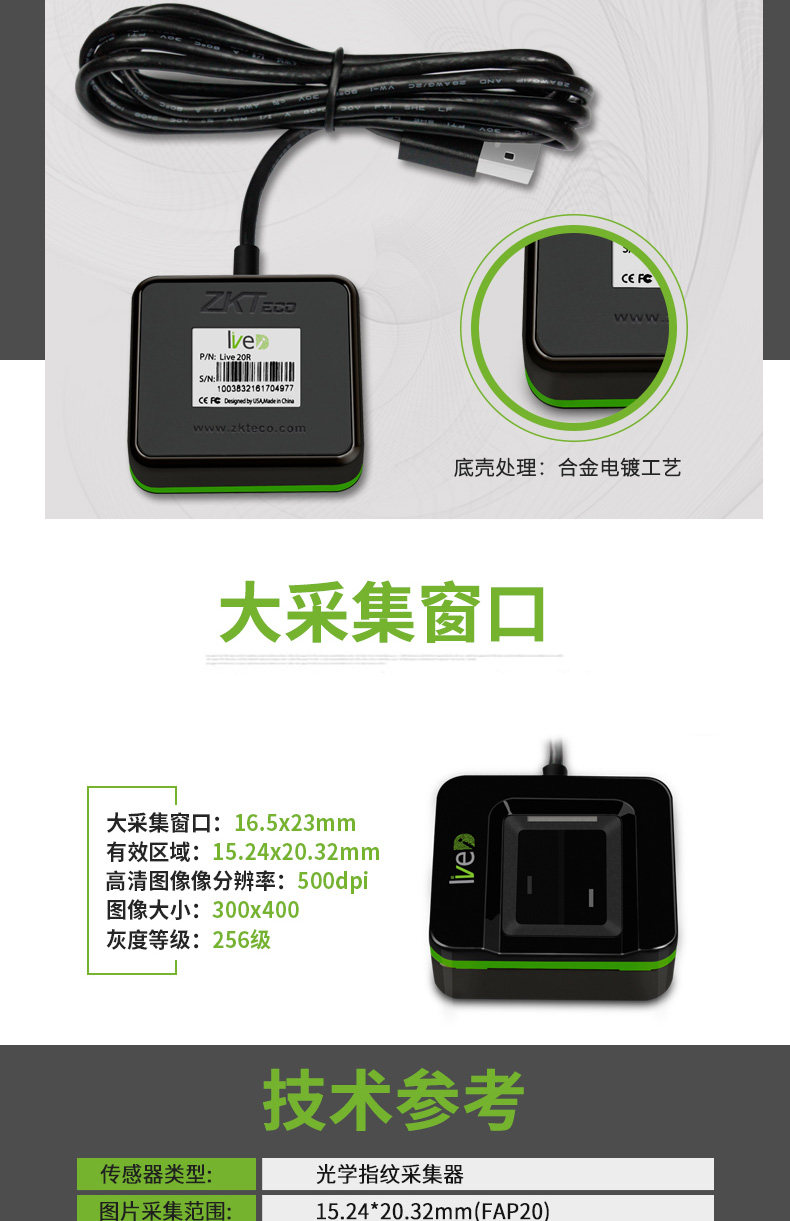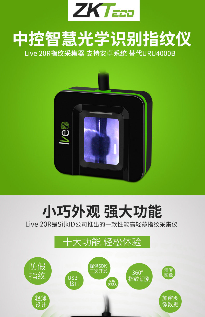 Live20R是中崆智慧新推出的一超薄、性能指纹采蘖器,它采用业界领先光学设计,具有抗强光及有效识别假指纹等功能。可支持WmdowsXP/7/S/IO/Vrsta(32/64bit),Linux(32/64 bit)、 Andriod系统,并且提供免费的SDK供客户开发。