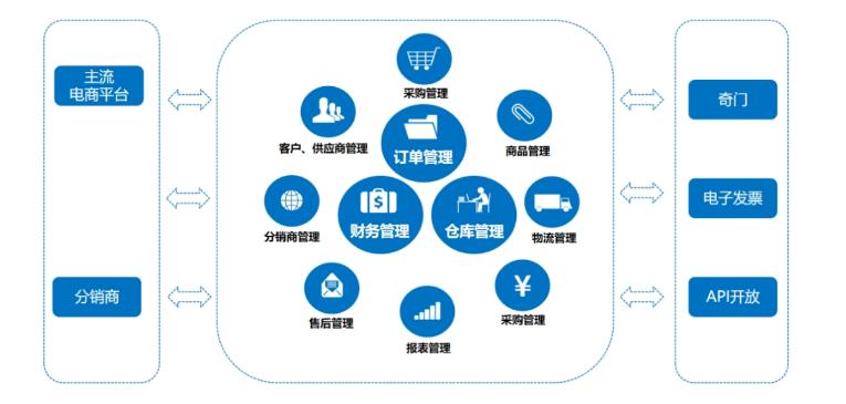 多平台、多渠道、多店铺统一管理;支持销售订单、库存、售后订单等自动同步;实现仓库无纸化办公;仓库规划及工作流程梳理;员工绩效全方位统计;财务、报表多维度统计。