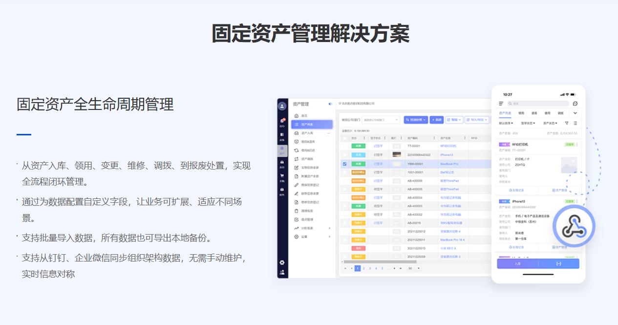 [ 固定资产管理 ] 支撑企业对资产进行从入库、领用、变更、调拨、盘点、到清理处置的全流程自动化业务场景。并通过多维度可视化的数据报表,既能跟踪每一个资产的使用情况,也能全局掌握企业资产状况。